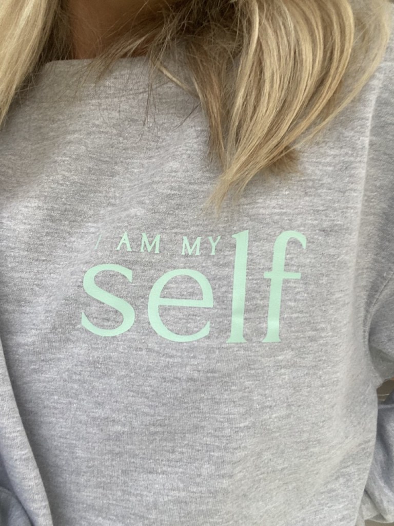 My custom made sweatshirt does just that – it’s a little reminder that you are yourSELF, no one else and that is something to celebrate and wear with pride! The sweatshirt is super cosy making it the perfect layer for Savasana. Available in light grey with ‘I am mySELF’ in mint imprinted on the heart space.